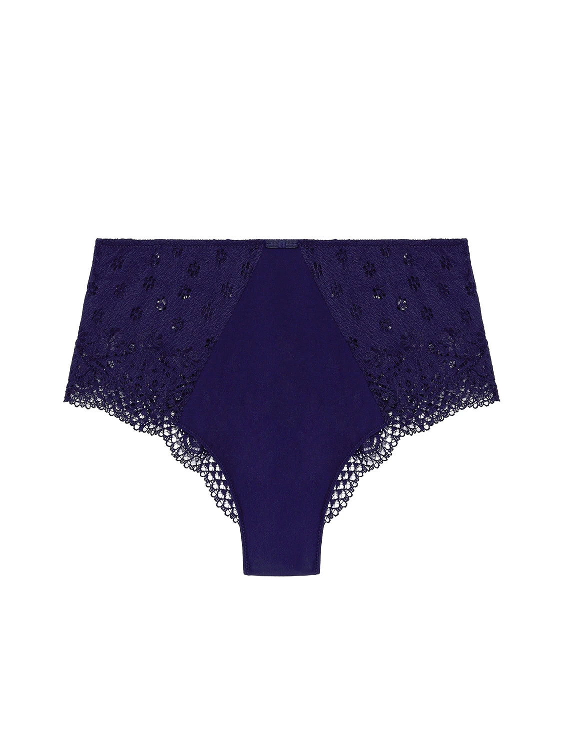 A delightful, retro addition to your top drawer. The Aimee Retro High Brief provides full coverage and a slight bit of sculpting, sitting neatly atop your hips with a wide waist band. Crafted from Italian lace, the design features a seamless gradation of opaque floral embroidery and a Guipare scalloped edge atop the legs. A knitted front provides modesty, while a 100% cotton gusset panel improves comfort. Aimee is part of the Simone Cares initiative, a company-wide promise to reduce environmental impact with positive action.