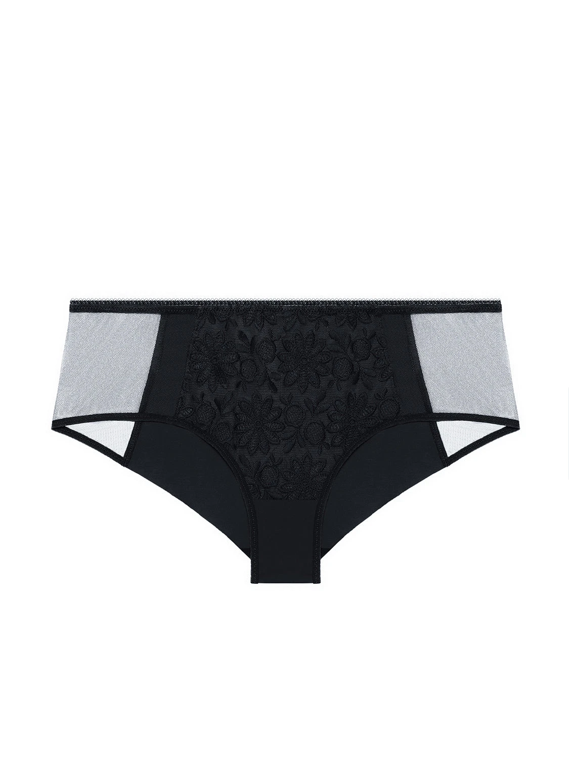 The Amazone Shorty is a cheeky brief crafted from ultra-feminine fabric for playful sophistication every day. A front panel of sheer tulle decorated with striking modern embroidery creates an alluring glimpse of shadow on skin, whilst a gathered bottom contours curves for a figure-flattering silhouette. With clean-cut seams and a mid-waist style for invisible wear under clothing making, youโll love this versatile everyday essential.