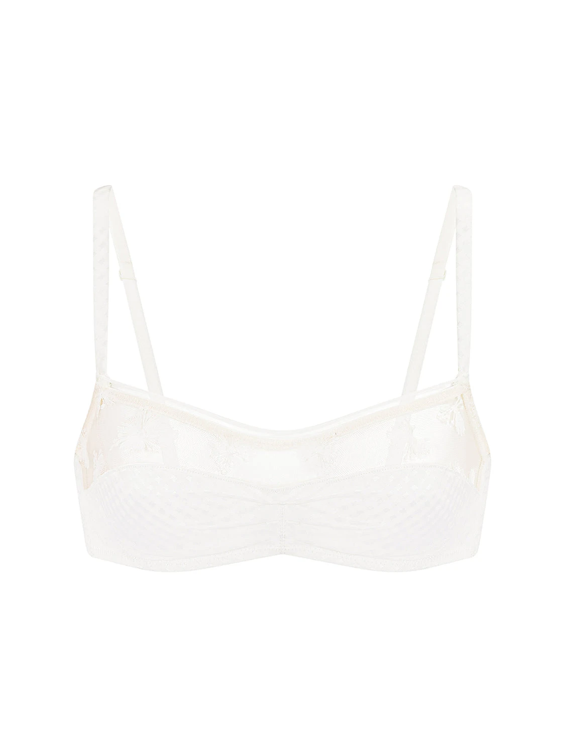 The Augustine Wirefree Triangle Bra is classic bra in Italian Jacquard satin made using a recycled polyester. It has a plunging neckline and opaque lower cups, featuring tattoo-effect embroidery on the upper cups. Small gathers on the centre front of this lingerie and a horizontal seam with a retro feel, while an elasticated underband and wires at the sides lend practical support.