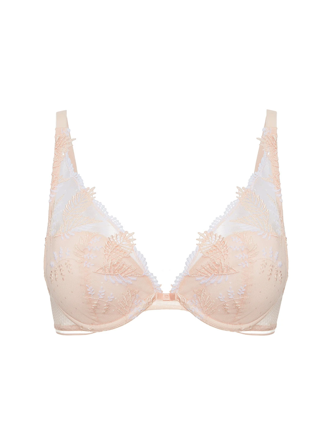 The Bloom Plunging Push-Up Bra imbues haute couture detailing with Swiss embroidery and Italian dotted Swiss crêpe for an ultra-feminine fit. The plunging neckline embellished with guipure scalloping flatters, while foam-padded cups provide a cleavage-boosting effect. The cups are detailed with intricate embroidery, and feature new removable pads with beads to volumise the bust as desired. The underwired bra is brought together with a quaint bow centred between the cups, and a straight, dotted crêpe back frames the back with decorative elastic.