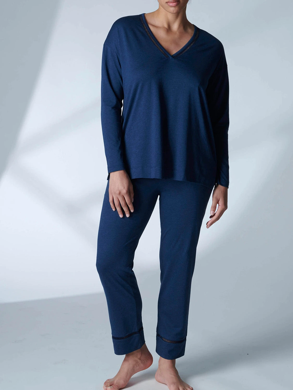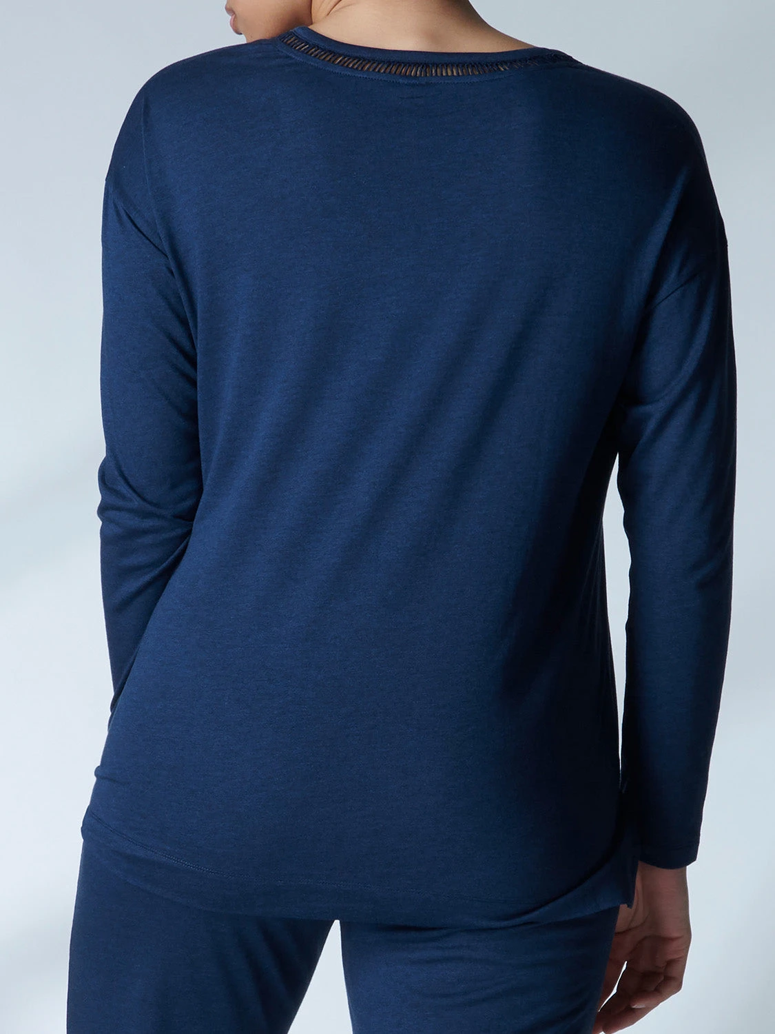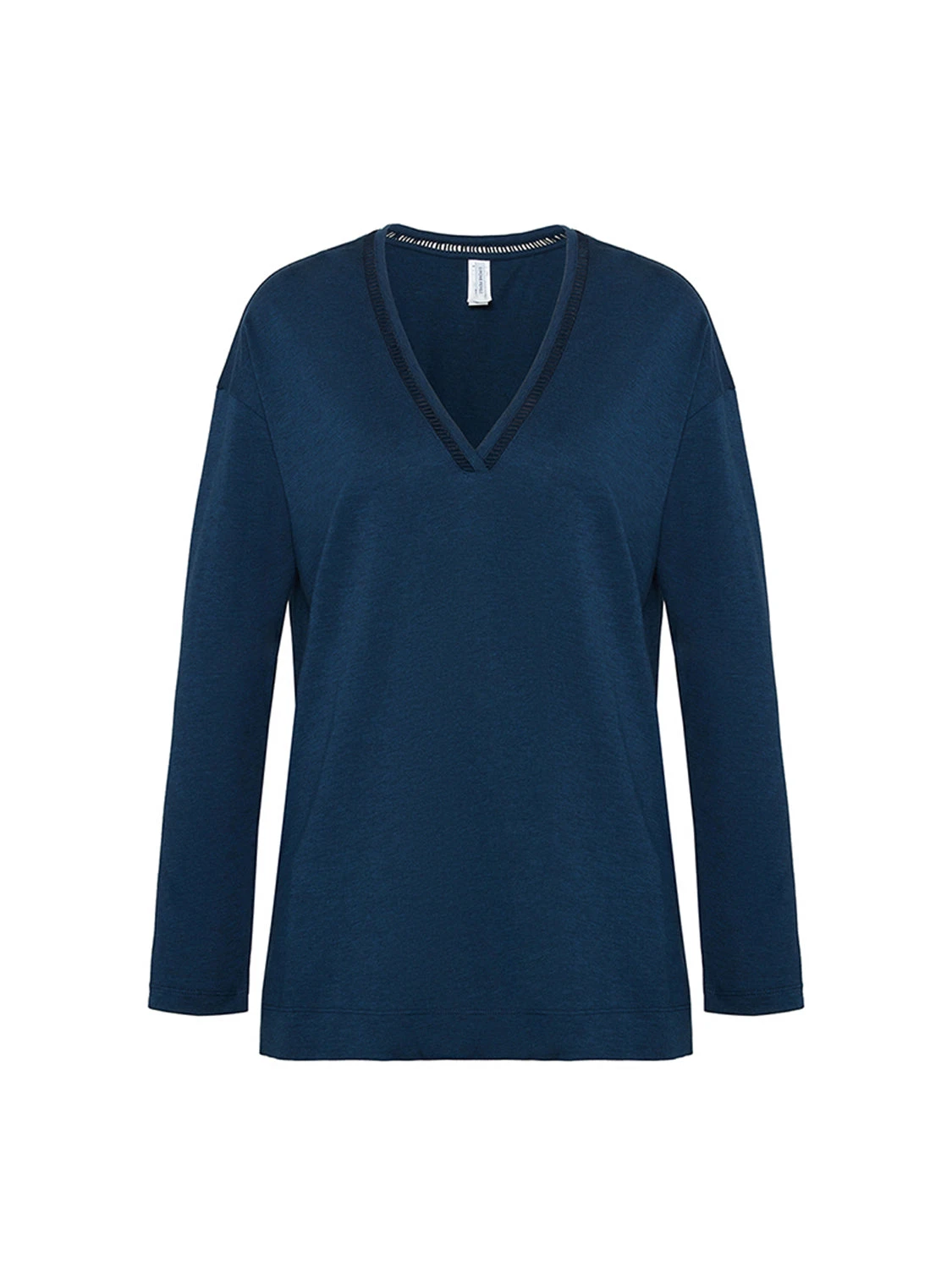 Long-sleeved sleepwear for the conscientious lounger. This long-sleeved top can be perfectly paired the Brume Night Pant. And, because it’s made from Brume range’s signature lyocell and cotton blend, it can be relied upon for naturally soft breathability that’ll keep you cool in summer and warm when the winter duvet reappears. It’s lightweight, easy to care for, while the clean lines with a plunging V-neck are helping make this a new slouchy and chic Simone Pérèle favourite.