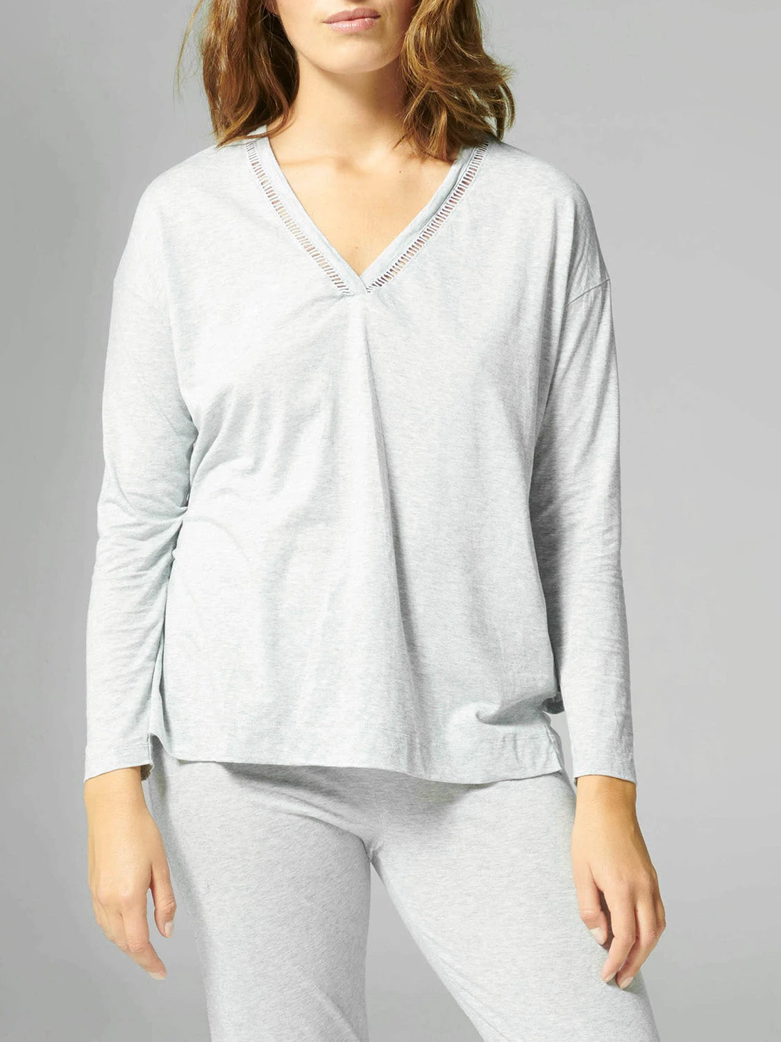 Long-sleeved sleepwear for the conscientious lounger. This long-sleeved top can be perfectly paired the Brume Night Pant. And, because it’s made from Brume range’s signature lyocell and cotton blend, it can be relied upon for naturally soft breathability that’ll keep you cool in summer and warm when the winter duvet reappears. It’s lightweight, easy to care for, while the clean lines with a plunging V-neck are helping make this a new slouchy and chic Simone Pérèle favourite.