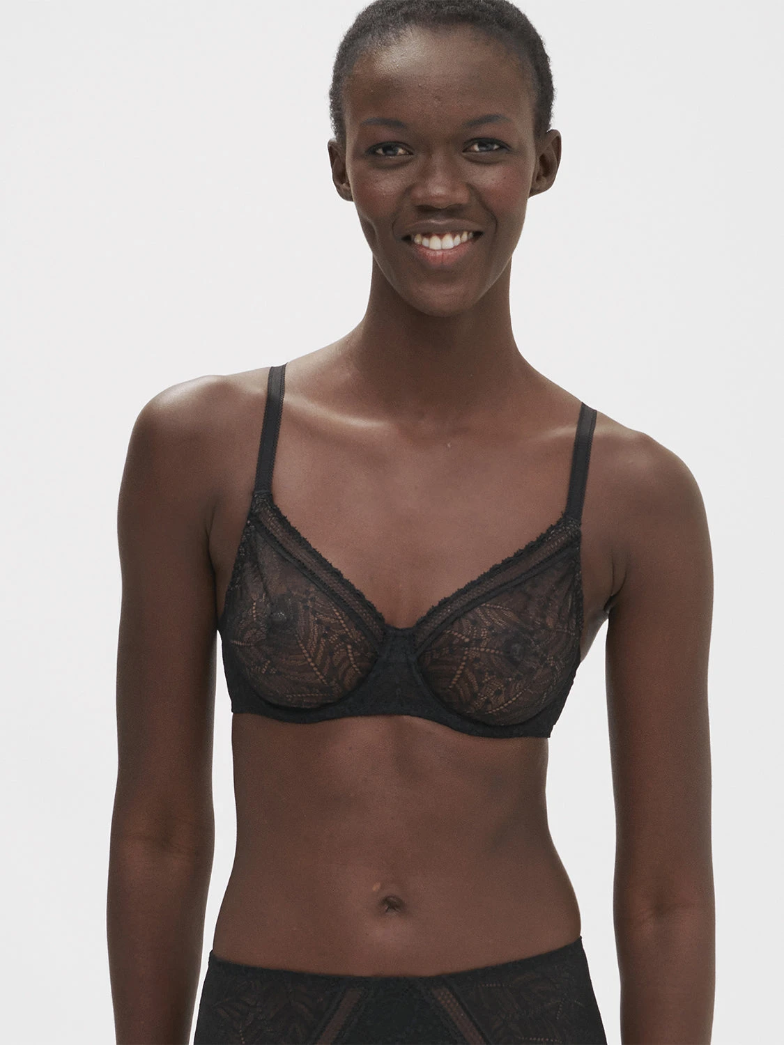 - Unlined semi-sheer cups with inner tulle lining for support and shaping