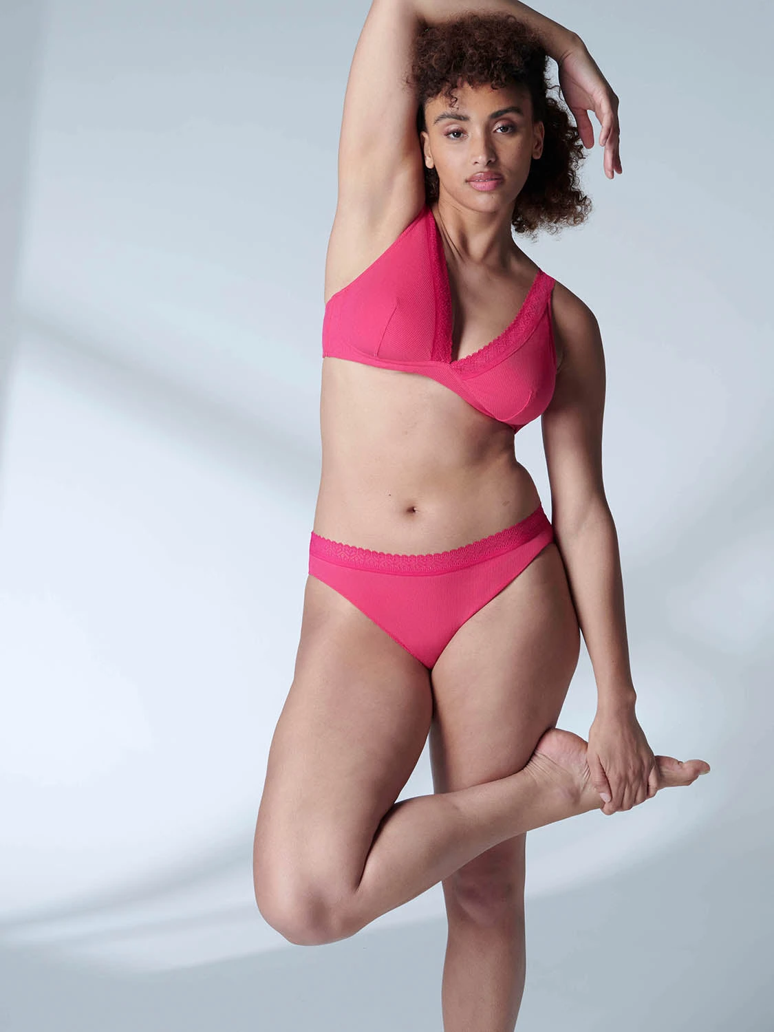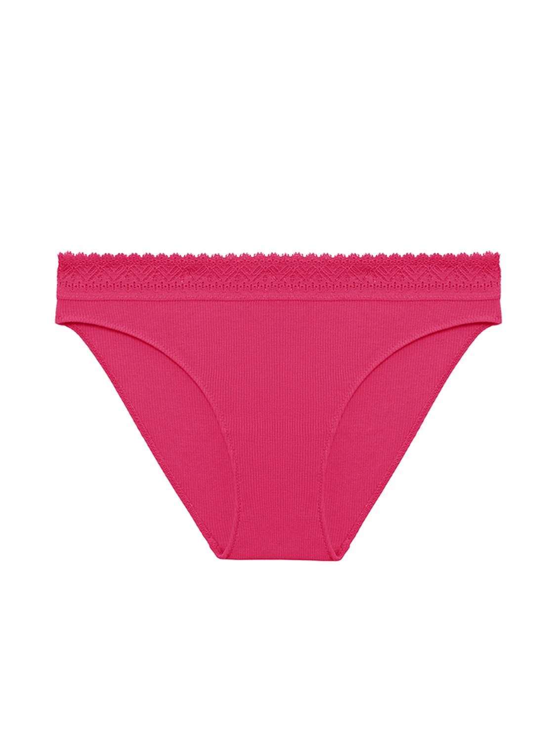 The Eugenie Bikini Brief is a ribbed modal and lace underwear style that has a front and back in ultra-soft modal, a naturally sourced material derived from wood cellulose. Soft elastic around the thighs of these panties lend comfort and support, while the waist is trimmed in Valenciennes lace, made from recycled polyamide and recycled elastane. This is lingerie with a second-skin feel.
