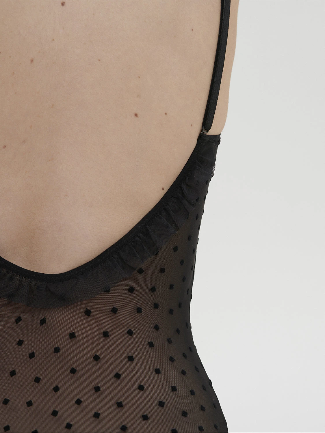 Crafted from sheer tulle flocked with velvet spots, youโll love the Lucie Bodysuitโs plunging neckline, ruffle trims and cheeky brief for a touch of fashionable luxury every day. Stretch French tulle hugs and comfortably flexes in all the right places making Lucie perfect for a day or night of play. Multi-position straps make it easy to customise this bodysuit to match your mood or your outfit โ pair with a blazer for an on-trend lingerie look.