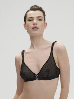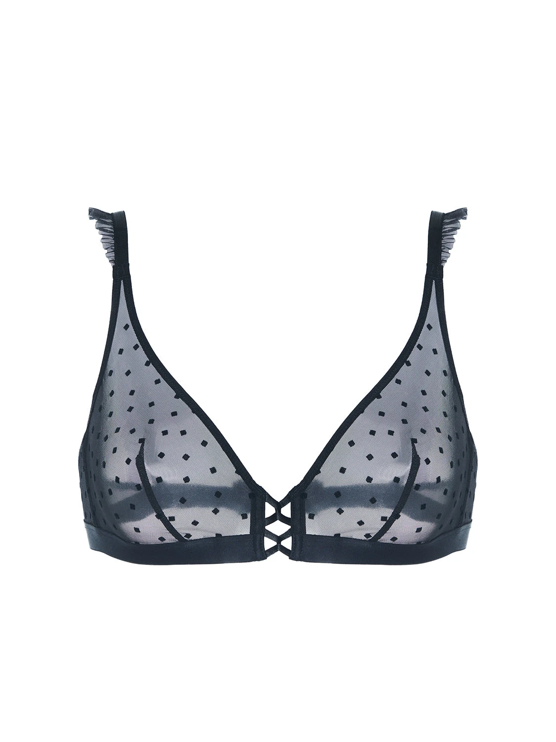 Playfully provocative, the Lucie soft cup triangle bra is the fashion forward lingerie piece every woman needs this season. Made from seductive sheer tulle, flocked with velvet spots, and finished with ruffle trims, Lucie’s wire-free triangle cups and wide under band provide lightweight comfort and stylish support. A plunging design makes Lucie perfect to pair with flirty low-cut tops.