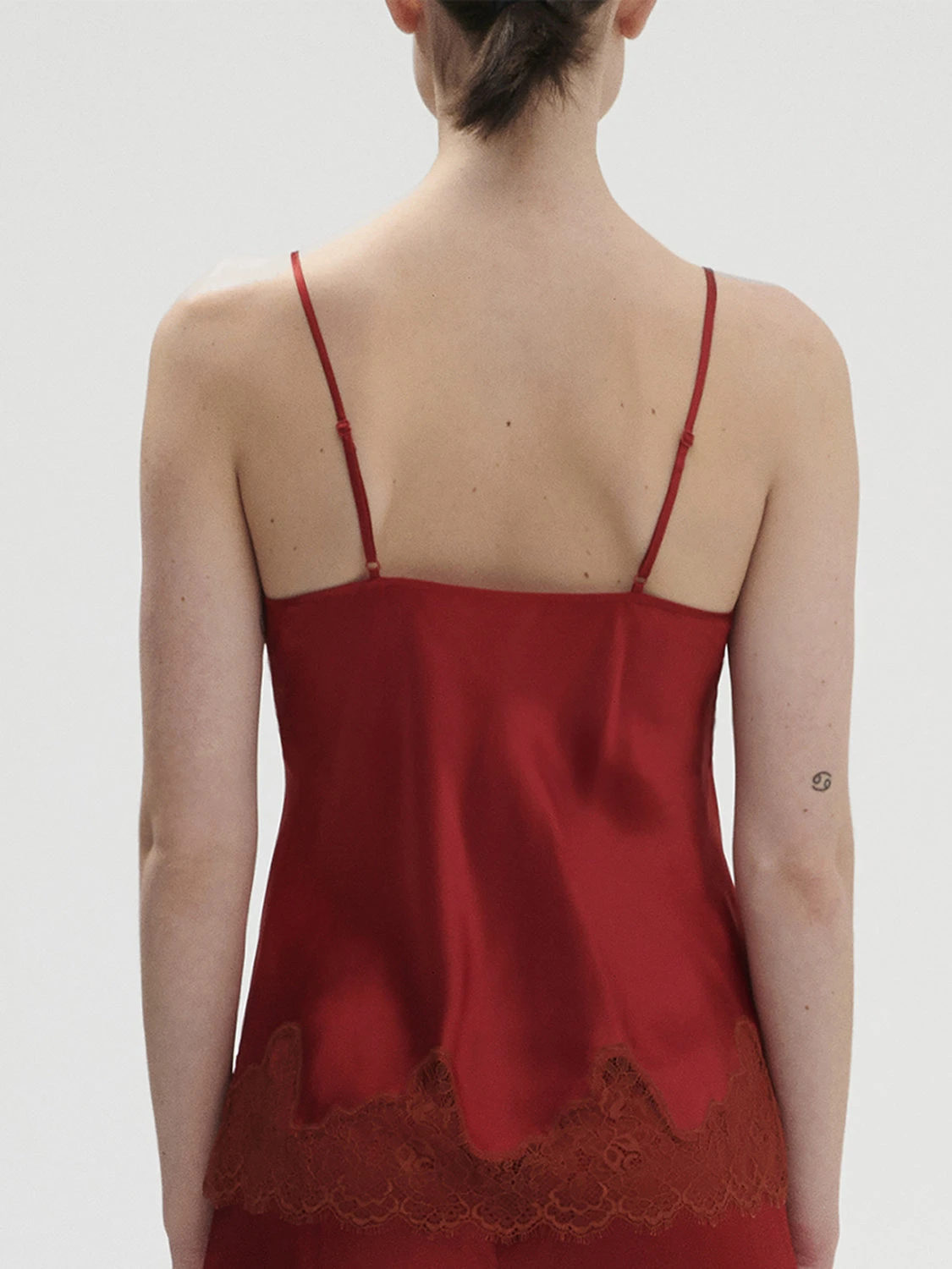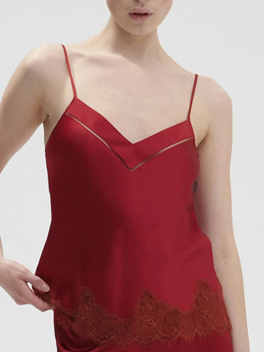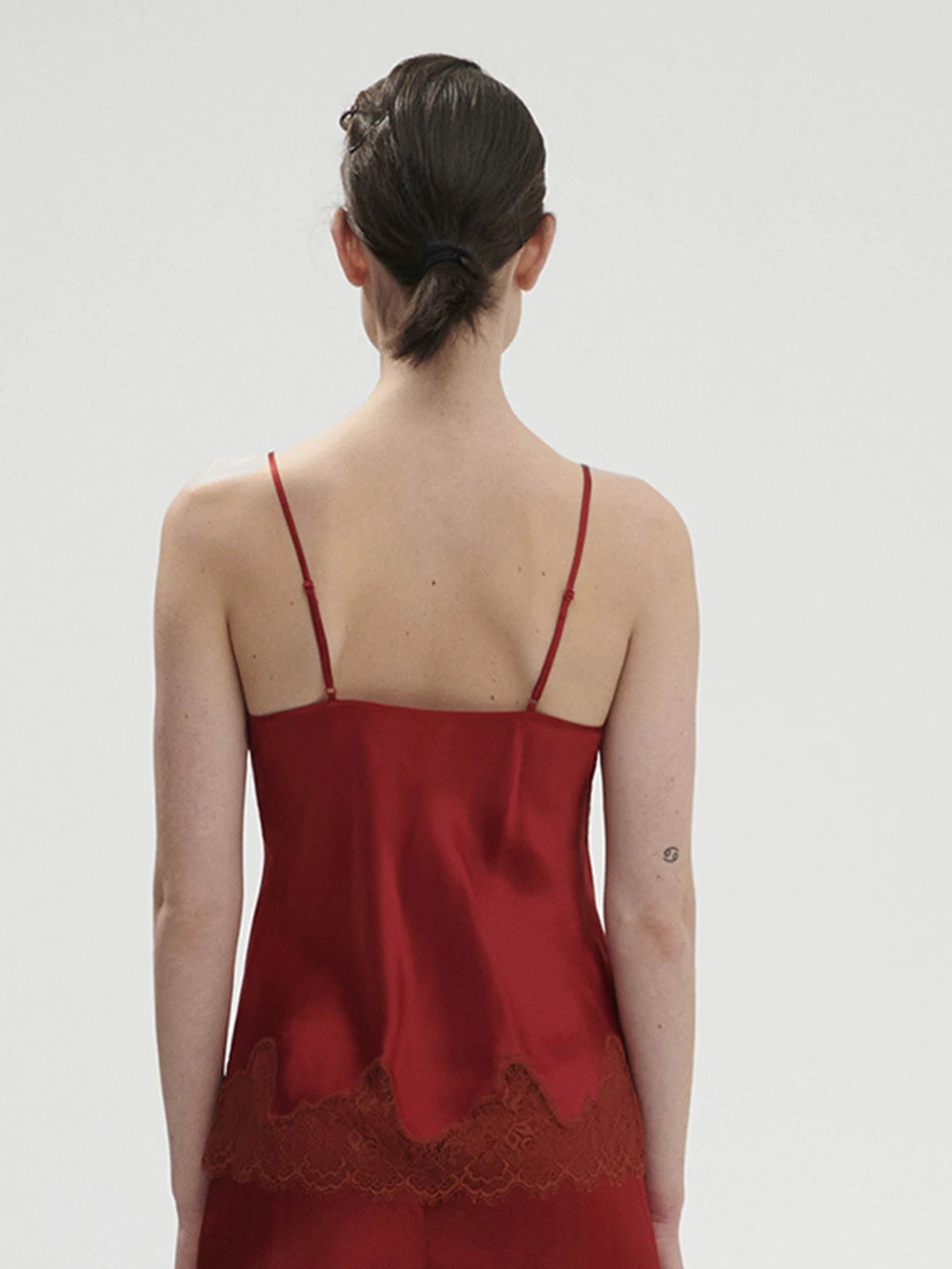 Turn day into night, night into day, with a versatile piece of silk and lace. The Nocturne Camisole is an exquisite example of delicate detail and elegant femininity. With fine eyelash lace along the bottom, transparent tulle underlining the V neckline, and thin adjustable straps, you can wear it to bed, or wear it out โ the choice is utterly yours. Pair this Camisole with the Nocturne Night Short for a classic and versatile silk pyjamas set.