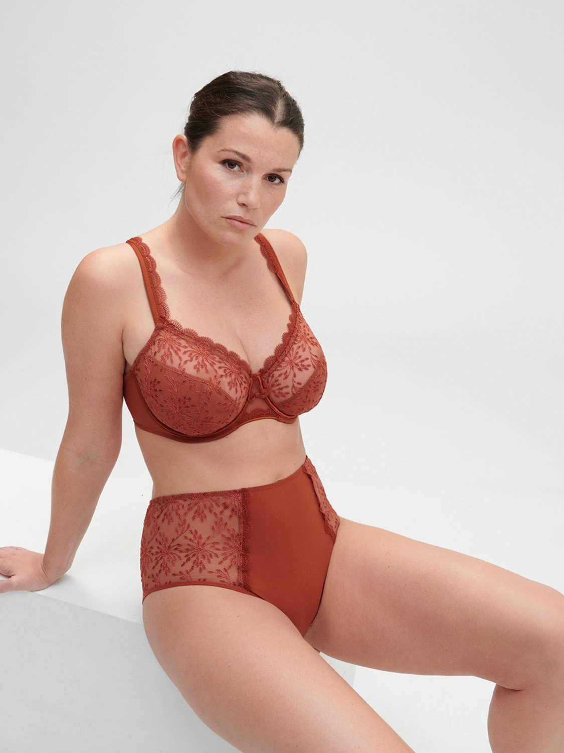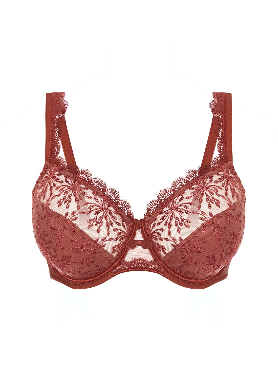Full support meets graceful detailing. The Singuliere Full Cup Support Bra in Sienna captures the best of comfort and style in an alluring Leavers lace finish. Featuring embroidered mesh panels, lace trimmed straps and a soft, cotton lining, this deep plunging design offers full coverage and comfort combined. Bringing form and femininity, the mastery is in the detail.