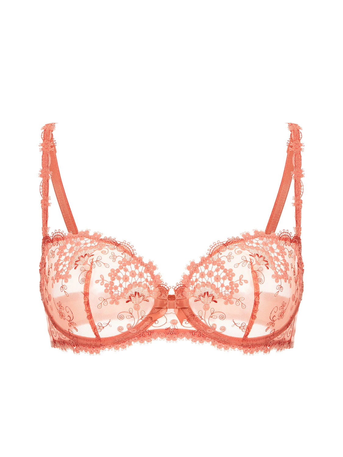 This romantic Half Cup Bra is a daringly beautiful balconette bra. The ultra-soft cups are intricately crafted with Guipure lace, while a high centre ribbon offers decorative support. This white lace bra is best suited to fine fabrics and low necklaces for a little added feminine flair.