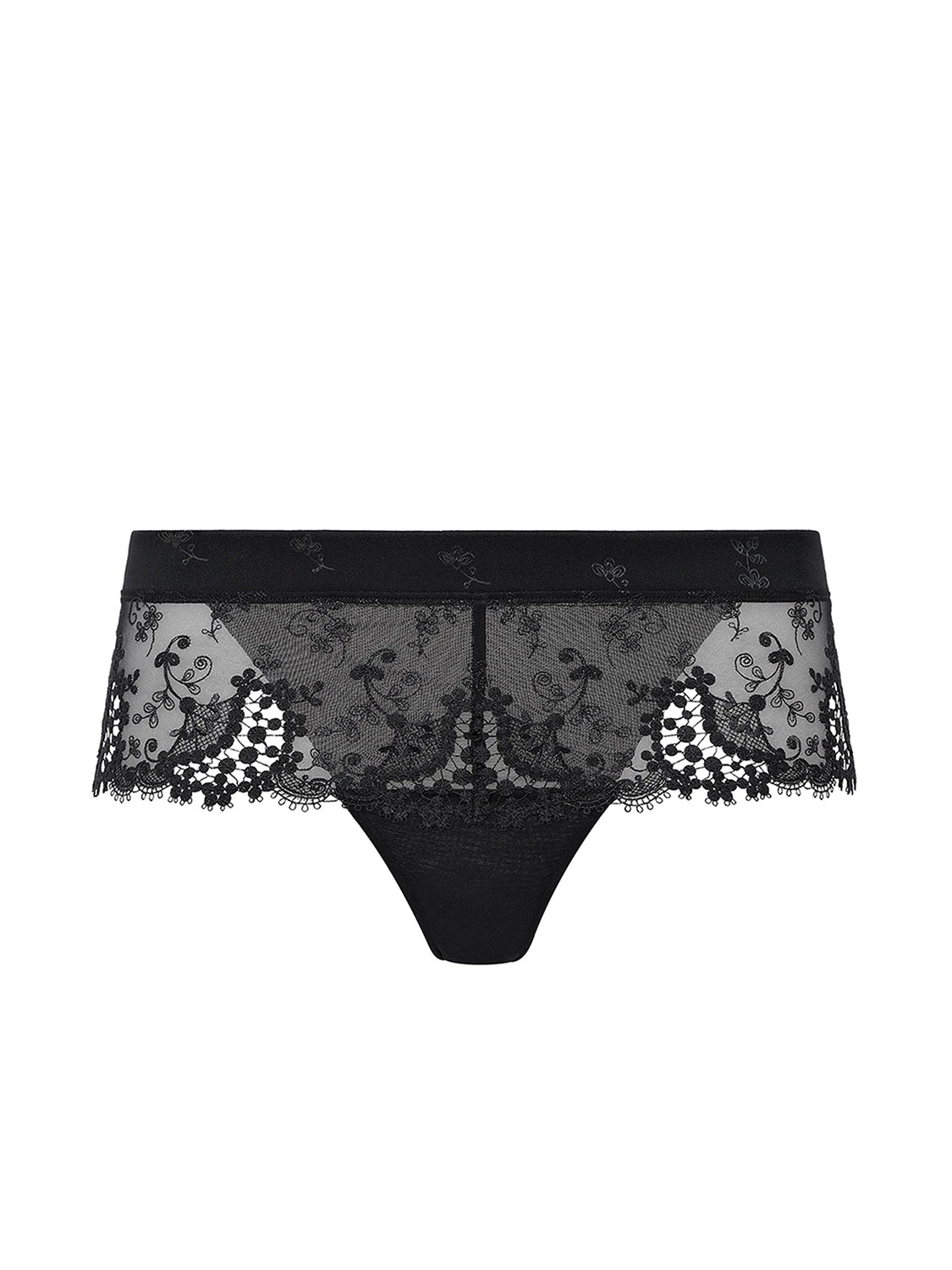 - Sheer boyshort back adorned with an embroidered flower